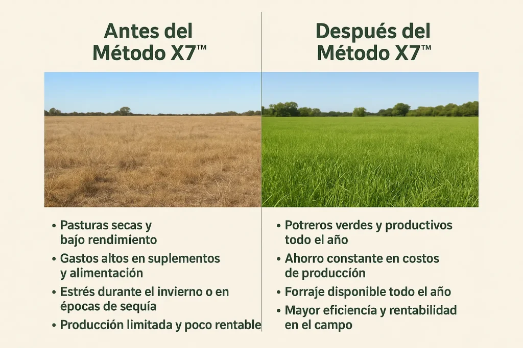 Con el Método X7™, vas a recuperar la productividad de tus potreros y producir hasta 7 veces más forraje, sin ampliar tu terreno ni aumentar tus costos.